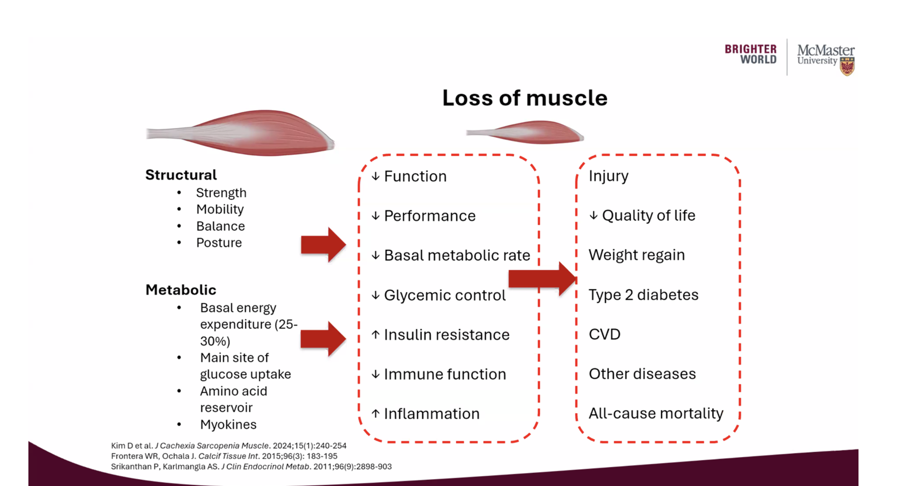 We know that muscle is the “metabolic furnace” of our body, and with less muscle comes slower metabolism, increasing fat deposits, and the metabolic risks that come with this - increased inflammation, risk of cardiovascular disease and insulin resistance (see the 2nd image below). Just because someone loses weight does not automatically make them healthier, and during this stage of life it’s important to look at all health indicators, not just weight or BMI: Quality of weight loss matters (image 1). “Sarcopenia” is medically significant muscle loss and can lead to myriad health issues in your 60s, 70s and 80s.
